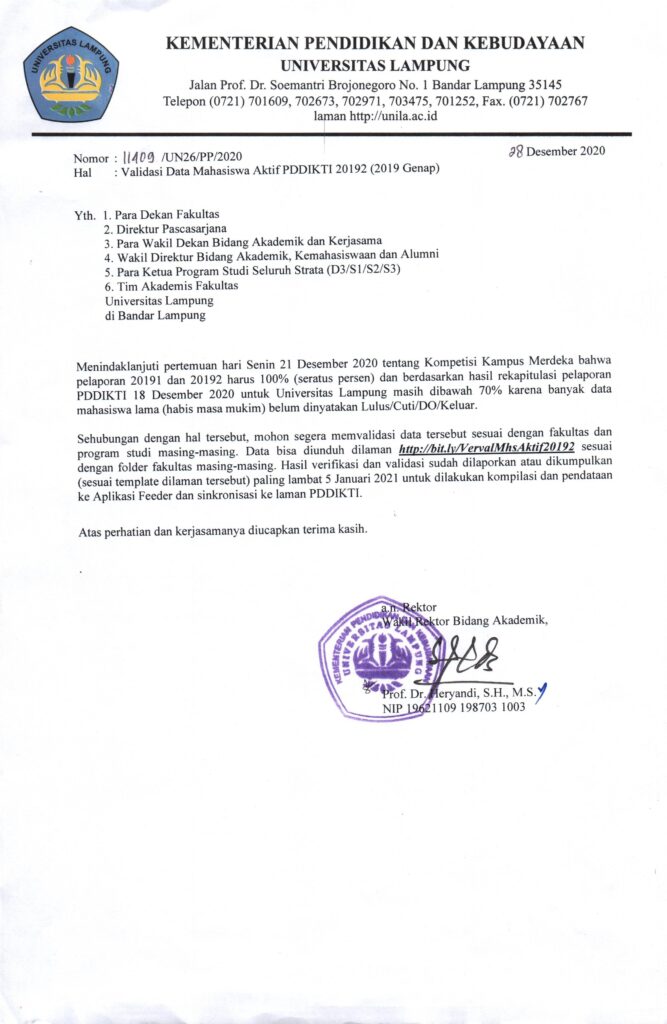 Validasi Data Mahasiswa Aktif PDDIKTI 20192 (2019 Genap) PSDIL Informasi 31 Desember 202031 Desember 2020