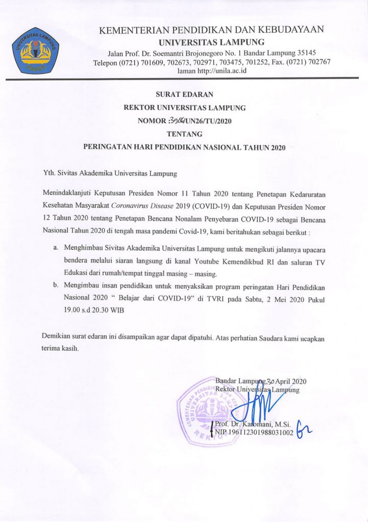 Surat edaran Rektor tentang Peringatan Hari Pendidikan Nasional thn 2020 PSDIL Informasi 5 Mei 20205 Mei 2020 0 Komentar